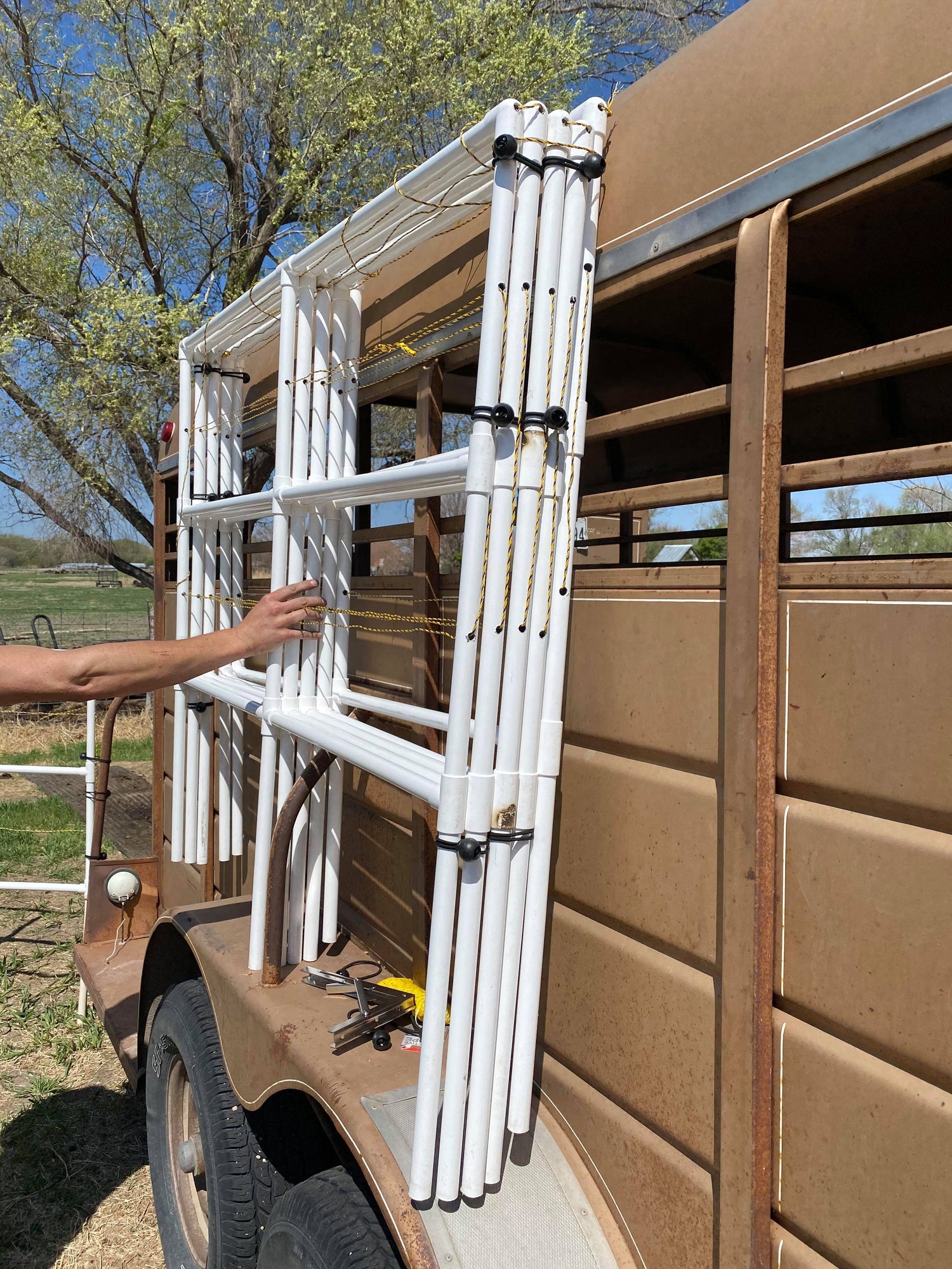 Easily mount your Camp Corrals to the side of your trailer! These heavy duty stainless steel folding trailer arms are rated up to 550 lbs. When you're not using the mounts, you can fold them down flat so they aren't a hazard to you and your horse. Does not come with straps to secure the panels in place. The folding arms are just to hold up the panels onto the side of your trailer only. You still need to secure them by using a strap (as seen in the second picture here).
